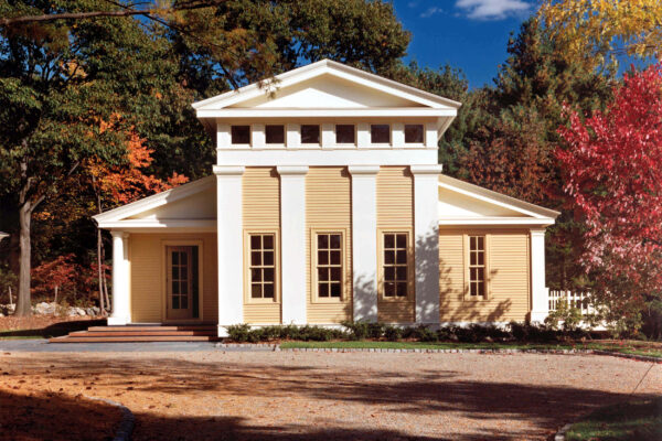 This small house with a large presence draws from sources far and near: ancient Greek Doric temples, Palladio’s ‘Redentore’ and Villa Barbaro, Peter Harrison’s Redwood Library, Jefferson’s Monticello, Asher Benjamin’s carpenter pattern books, and local Greek Revival building traditions of Concord.
