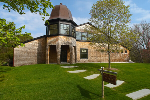 A broad gable gives the museum a public presence in the village, and a tower with a bell-shaped dome announces the entrance. An outside gathering space behind the museum with a large deck and gazebo overlooks and connects the building to a nature preserve.
