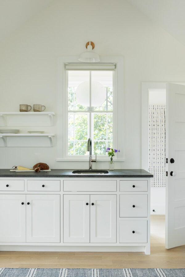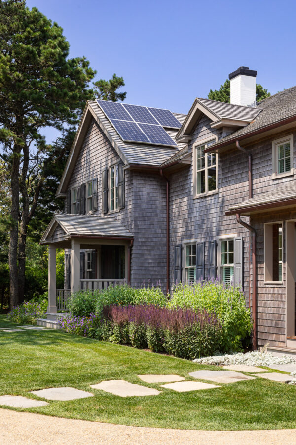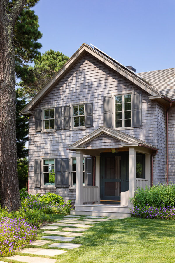 The house was gutted and given new systems and new windows. Before, there were several types of windows, including two-over-two and six-over-one double-hungs which we replaced with all two-over-two windows. We enlarged the water-side living room windows and created a wide opening with folding glass doors between the kitchen and waterside porch. New windows, insulation, and HVAC equipment improved the energy efficiency of the house. Existing solar panels were saved and reinstalled on the roof.