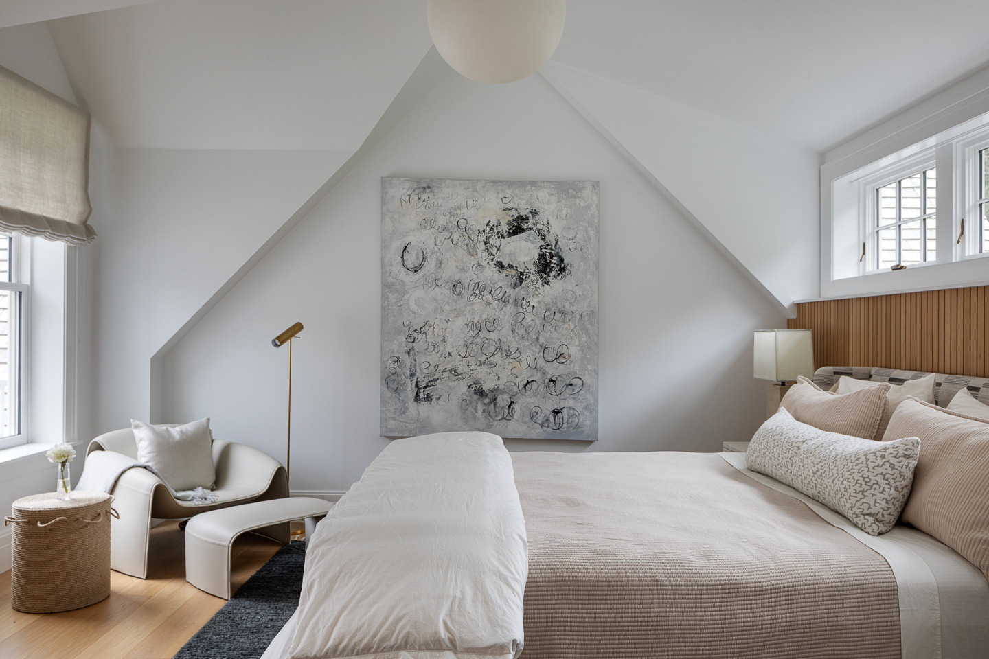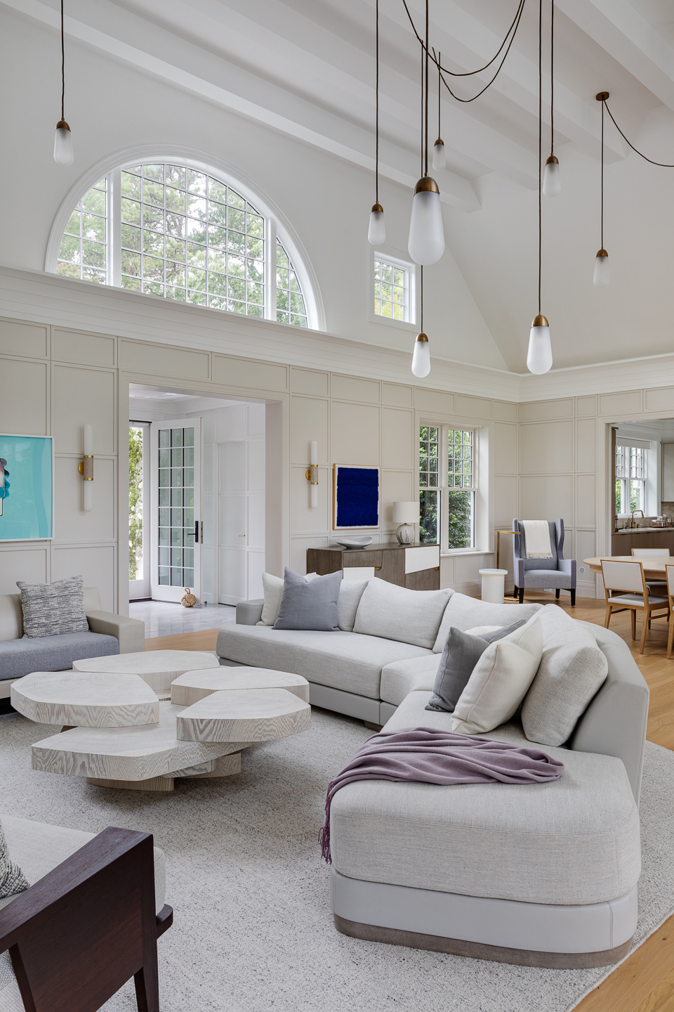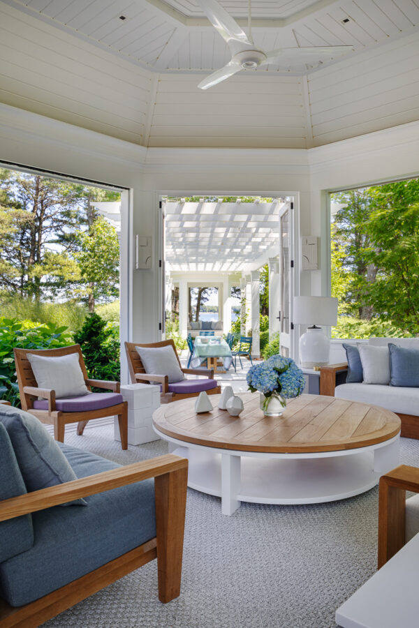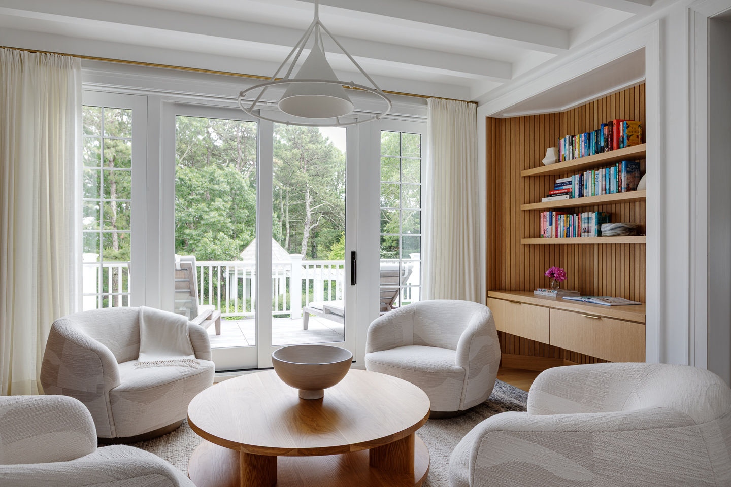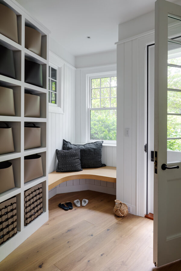 A small Greek Revival house was given a new foundation and a wing connecting to a new barn and embracing a protected garden. A long axial view from the front door through the new wing makes a small house seem bigger than it is.