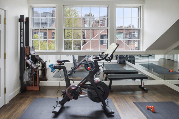 The first floor functions as a living room in the summer with French doors that open to the view. At the end of the season, the furniture is moved aside to make room for the pick-up truck. Lanterns suspended from the points of the roof are standard mooring balls fitted with light bulbs inside.