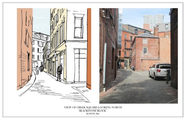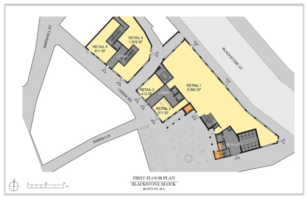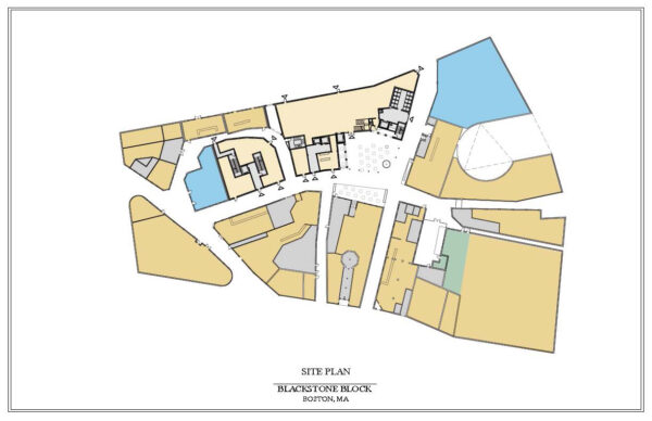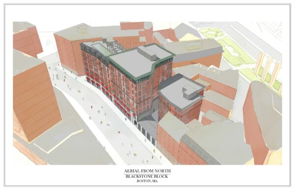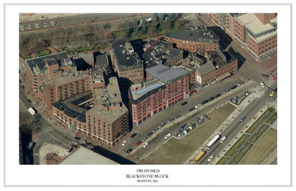 The Blackstone Block project is an urban infill mixed use project is downtown Boston.  The design includes 10,000 sf of ground floor retail, 10,000 sf of restaurant space on the second floor and 39 one and two bedroom apartments.  The buildings range in height from 55’ to 85’.  The design goals were as follows: