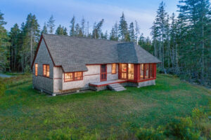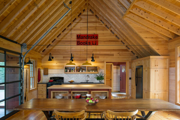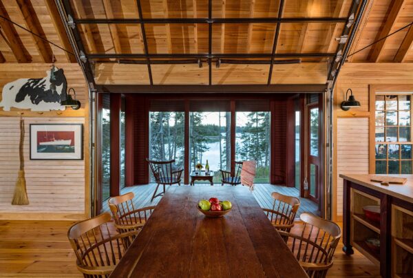 By dividing the house into three structures, the design shapes a small courtyard. The windows are carefully aligned with the meridian to manage the south sun. Following a long held New England building tradition, the exterior is sided in locally-sourced Eastern white cedar shingles.