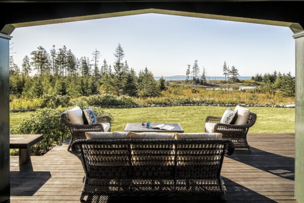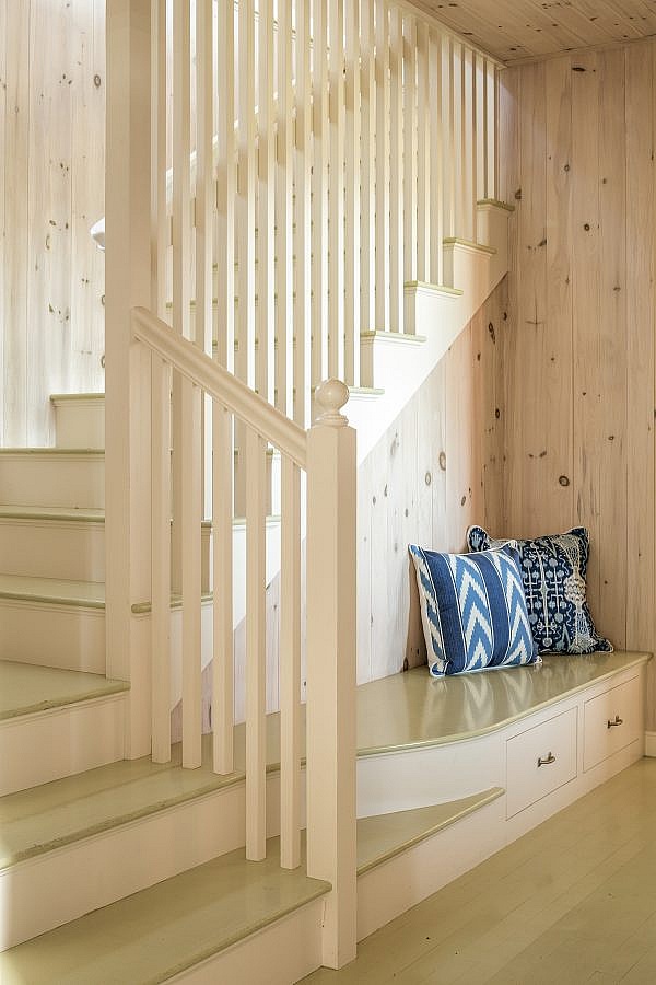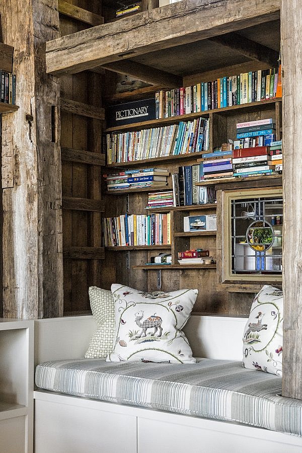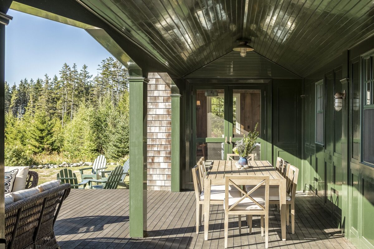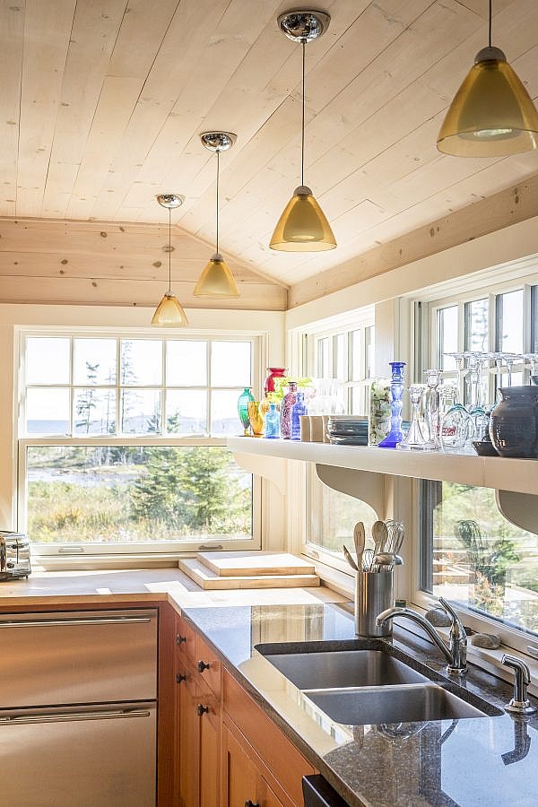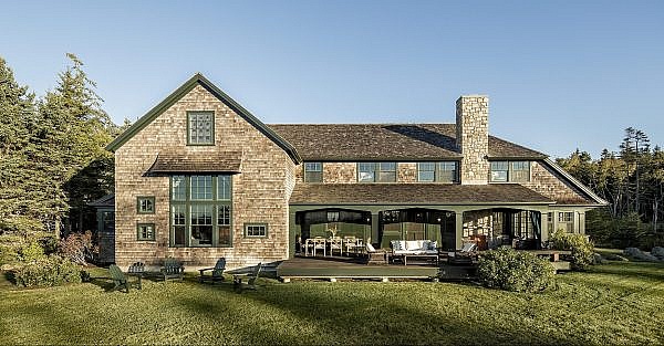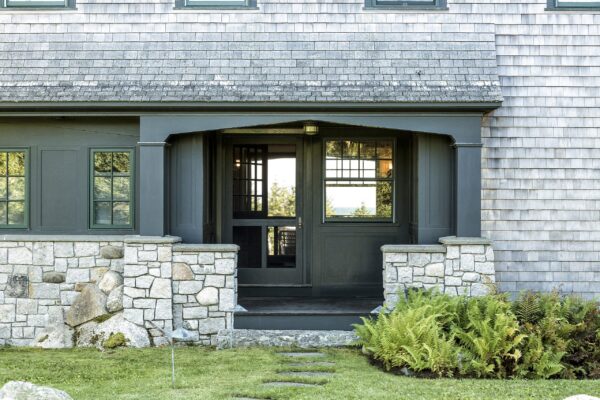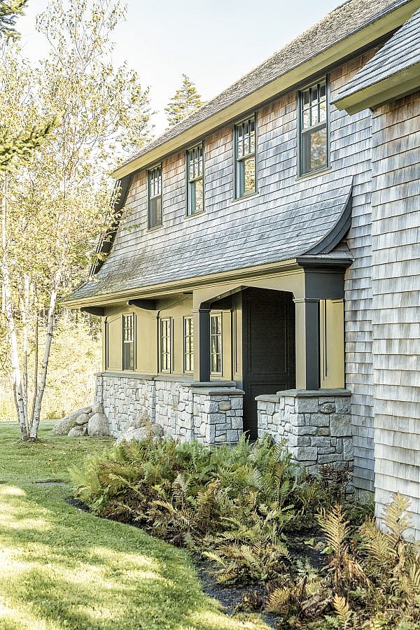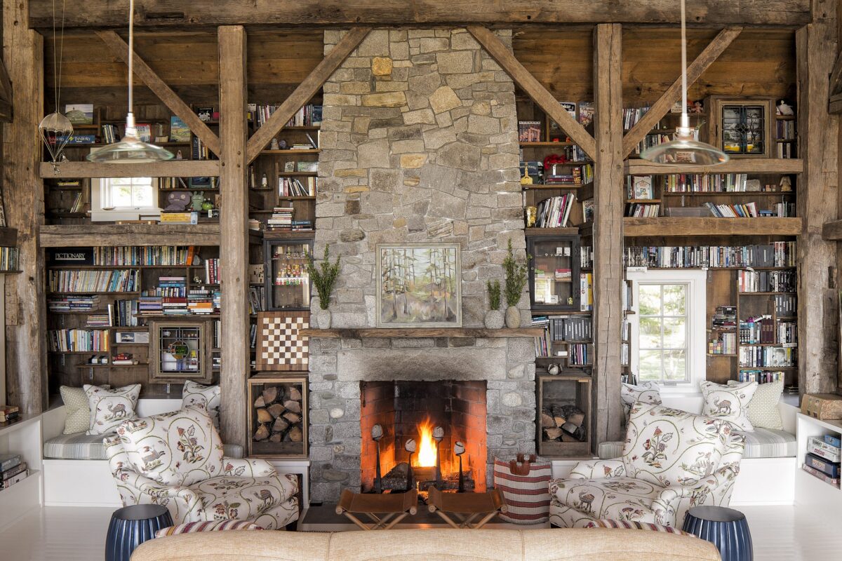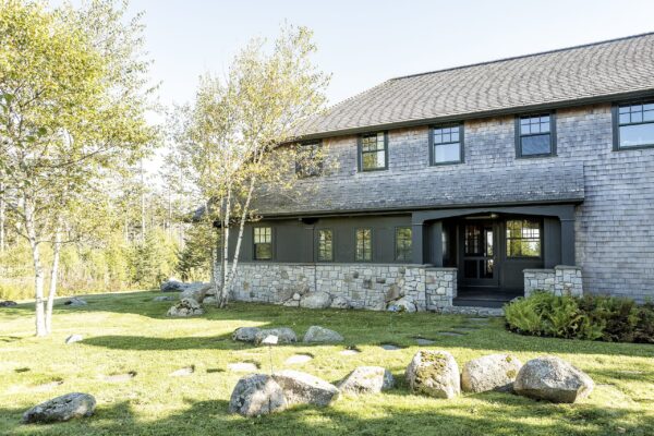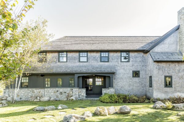 The large main barn room embraces the main living spaces, including the kitchen. The barn room is anchored on the north with a stone fireplace and on the south with a large bay window. The wing to the east organizes the entry hall and sleeping rooms.