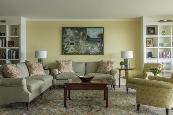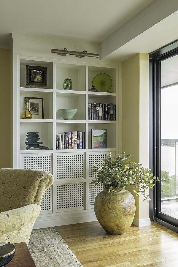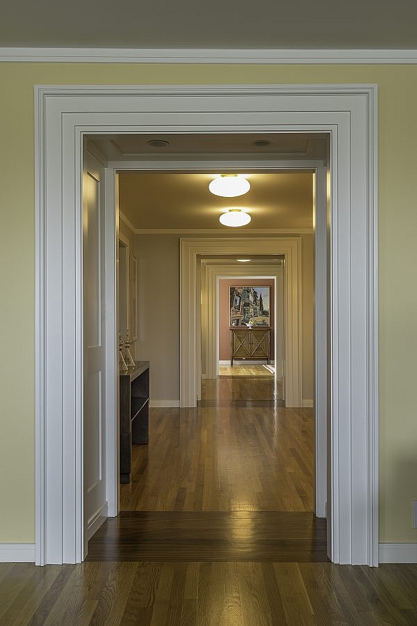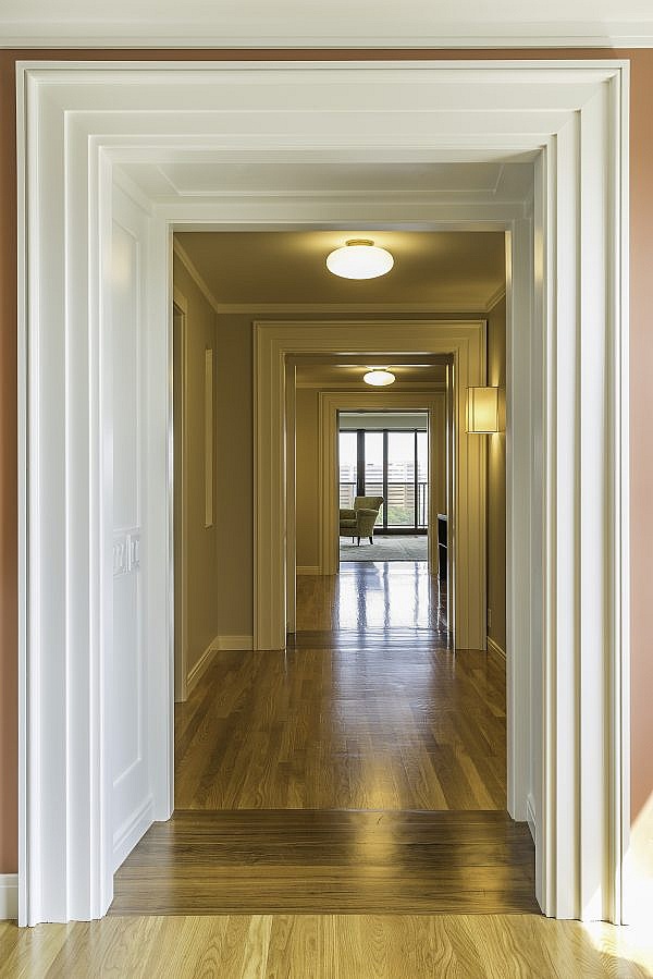 A shifted axis organizes the simply designed rooms and the long views through the apartment.