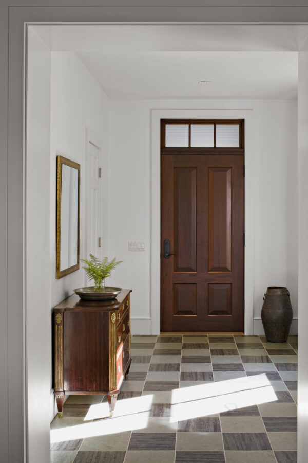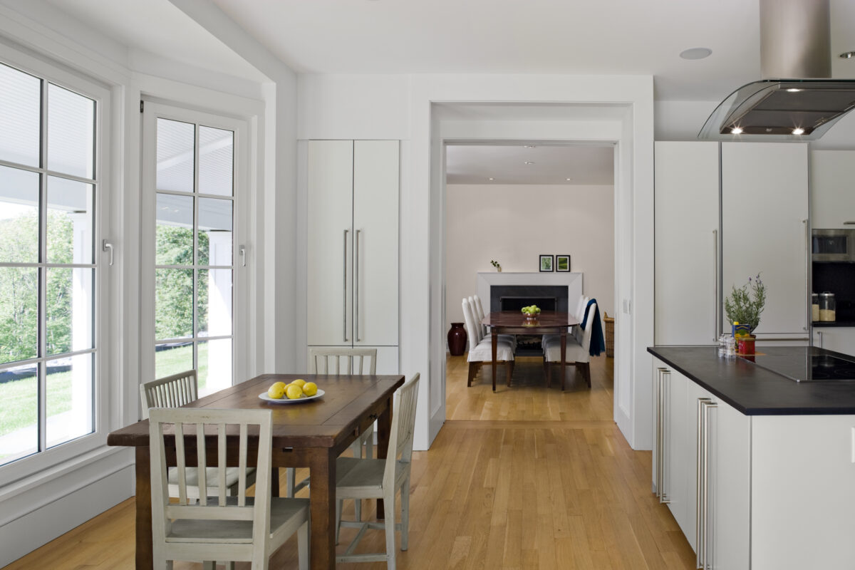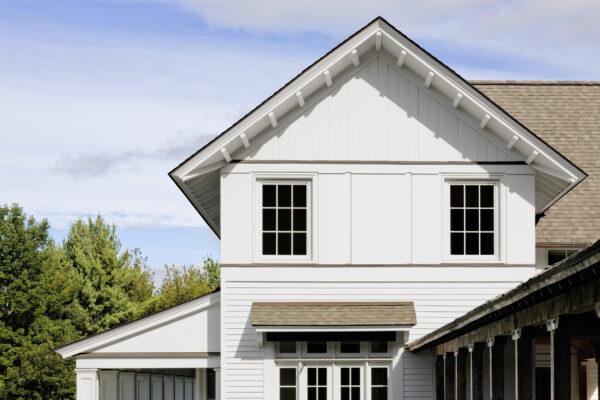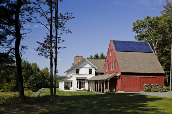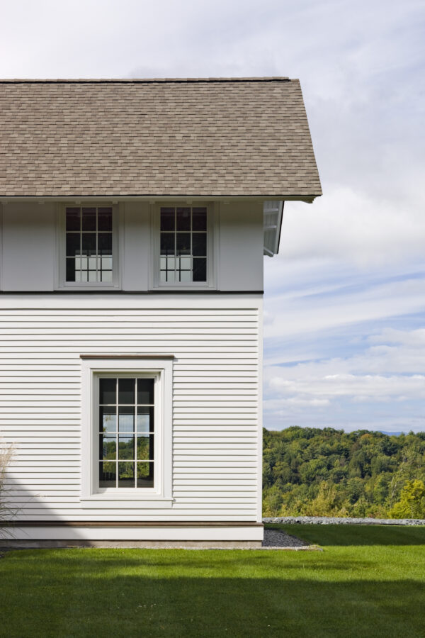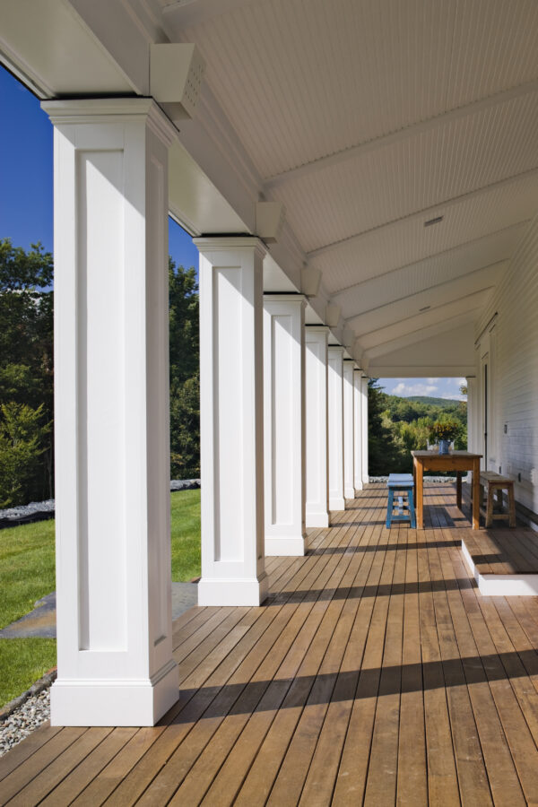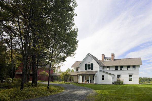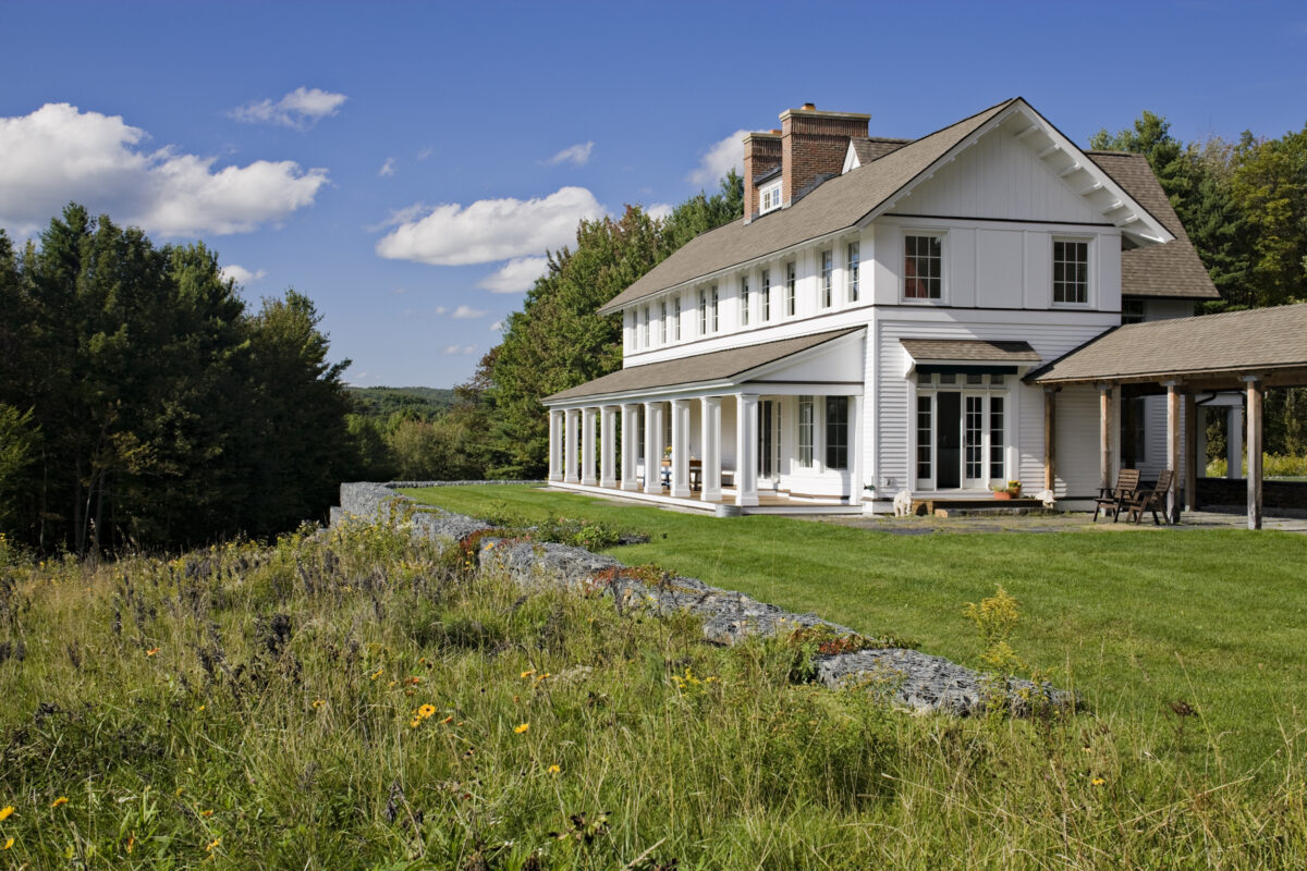 Farm Villa combines imagery of the New England farmhouse with that of the Neoclassical European villa. Columns vary according to a hierarchy of formality: plain square white columns for the entry porch, monumental paneled columns for the view-facing porch, and locally-milled timbers with metal connections for the outbuildings.