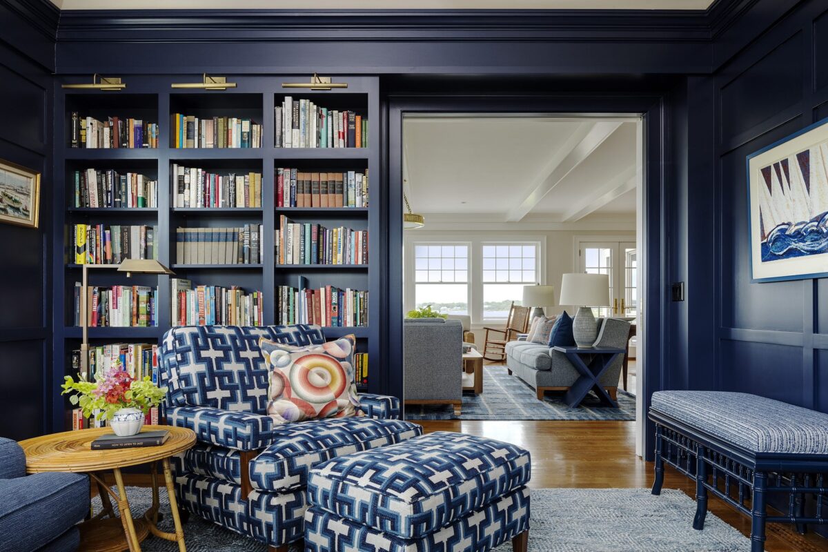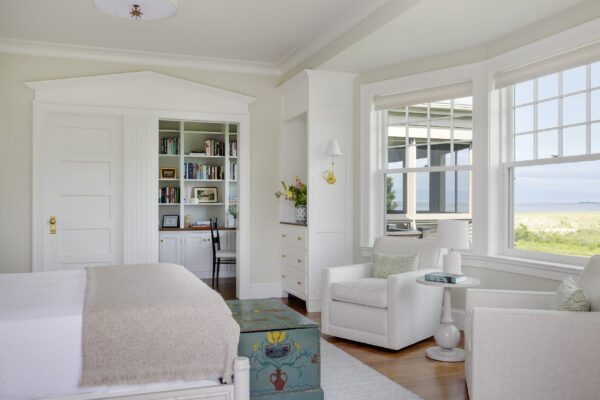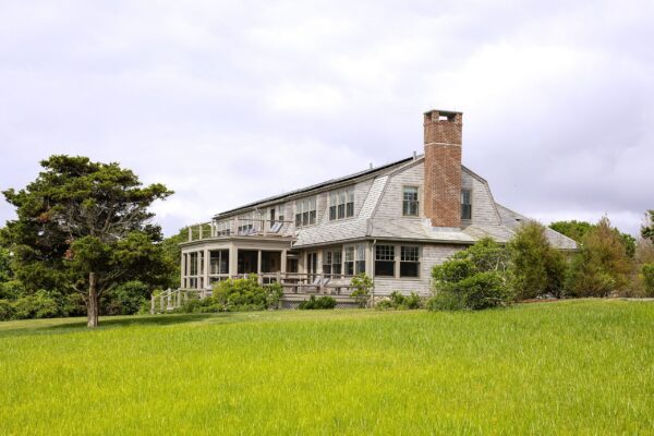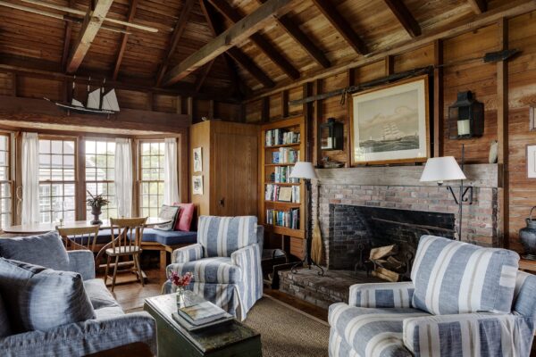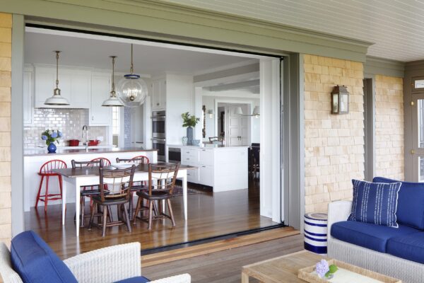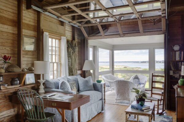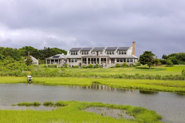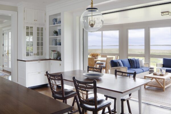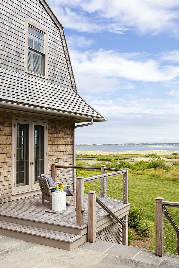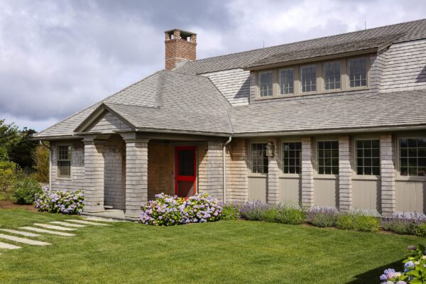 Island Cove House keeps a low profile on the horizon. On the driveway side it rambles along like a cottage that grew over time, while on the water side it is more ordered. Weathering shingles and gray-brown trim help the house blend with its surroundings. Heating and cooling are delivered by a geothermal system, and much of the electricity comes from solar panels.