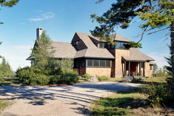 Island Cove House keeps a low profile on the horizon. On the driveway side it rambles along like a cottage that grew over time, while on the water side it is more ordered. Weathering shingles and gray-brown trim help the house blend with its surroundings. Heating and cooling are delivered by a geothermal system, and much of the electricity comes from solar panels.