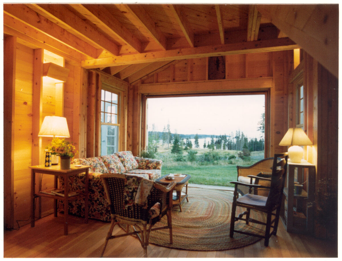 The main cabin and its outbuildings embody the simple life, with exposed studs and rafters. The outbuildings have no electricity or running water. Living in Snout House is a pure summer experience, close to nature. Simple but whimsical decorative elements add to the delight.