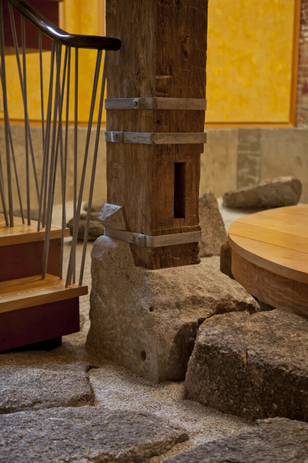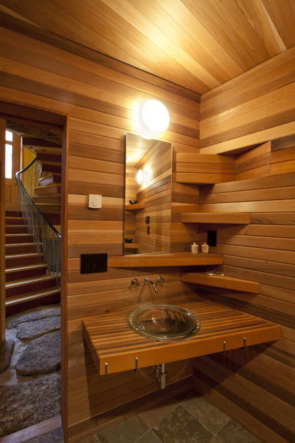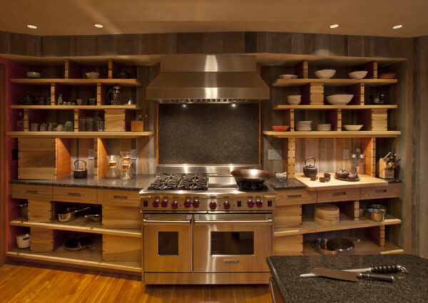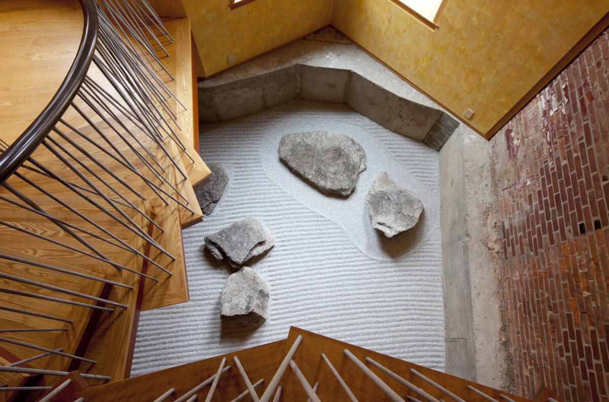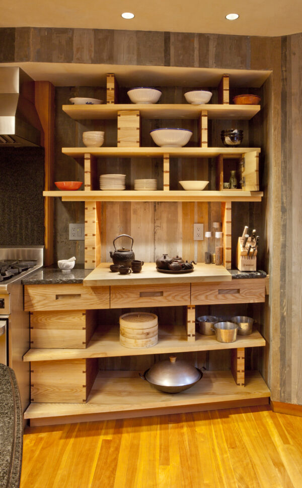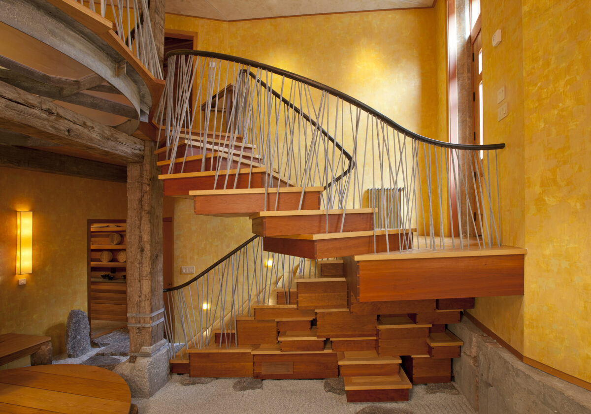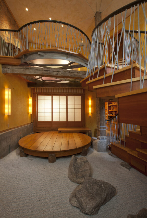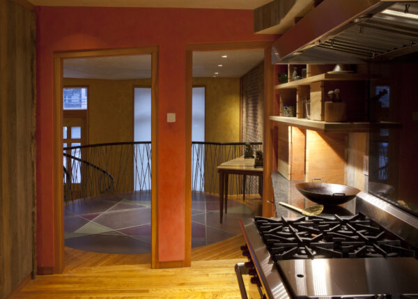 This eclectic and innovative design re-imagines how to live within a traditional 5-story Boston townhouse. Some floors were removed and the basement excavated to create new double-height spaces. A new stair animates the space with a collage of seemingly randomly stacked boxes that tumble between the two levels.