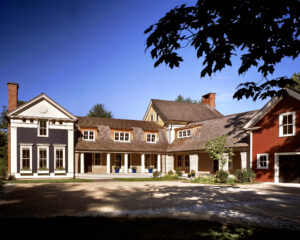Down a sweep of lawn and pasture, this big house looks like a collection of small houses. Greek Revival-inspired pavilions are connected by a Shingle Style link, uniting various regional traditions. The elliptical ceiling of the kitchen eating area looks like a shallow, tented canopy.