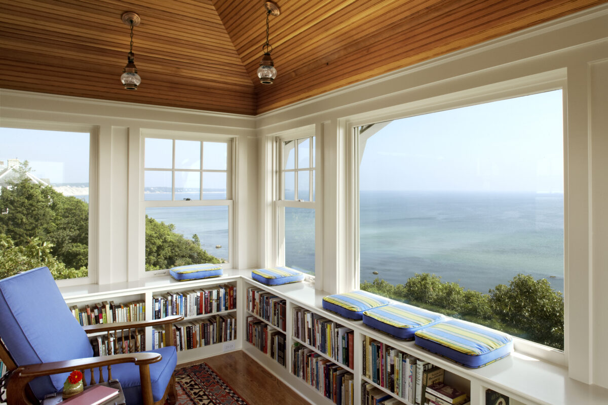The center of this compact house is a high, open room combining living, dining, and kitchen. Windows on both sides open to the views and the sea breezes, and dormers fill the space with light from above.