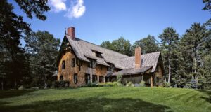 With Medieval overtones, this shingled house centers on a great hall with trusses of reclaimed timbers, and a musicians’ gallery at one end.