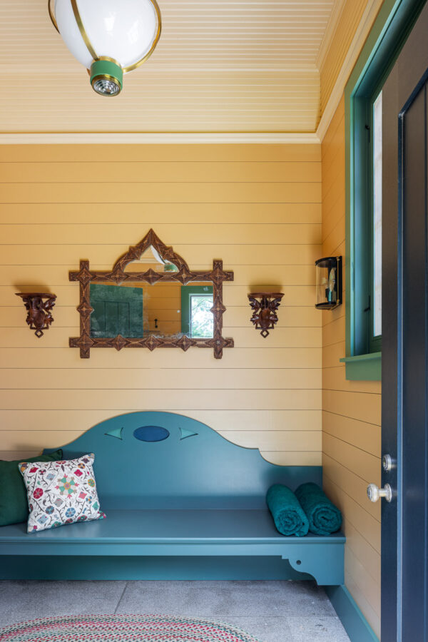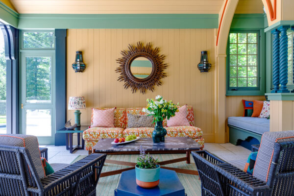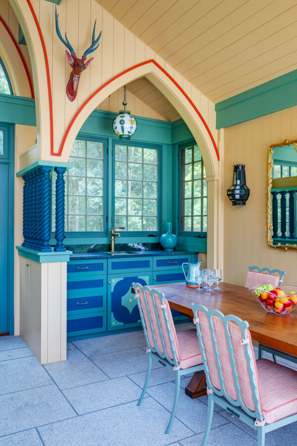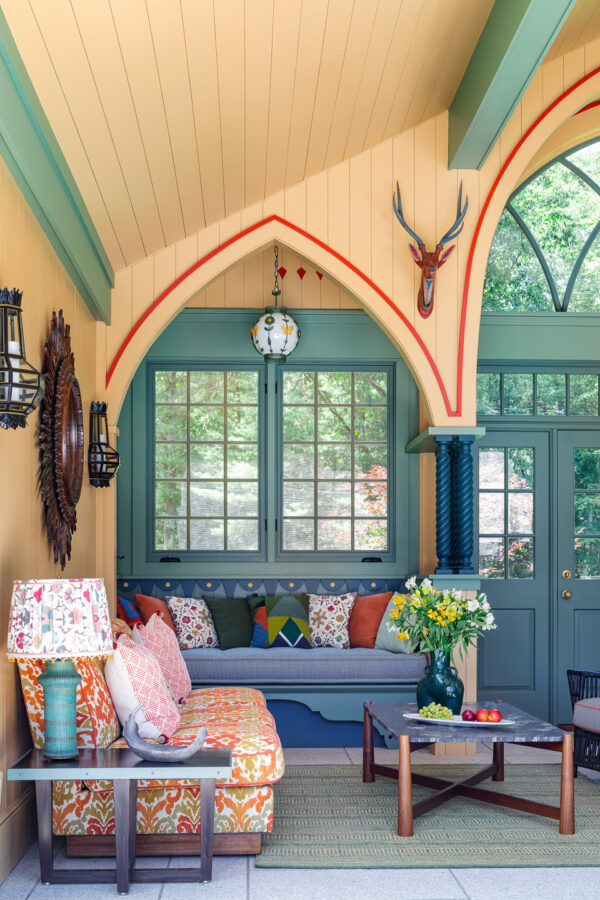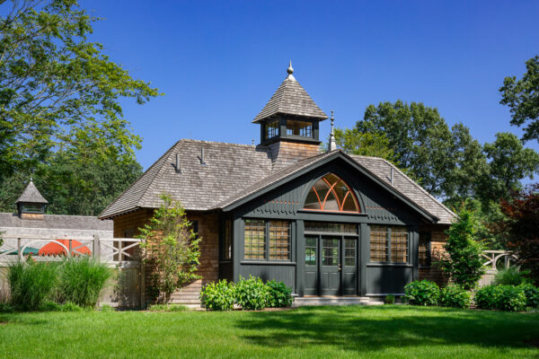 Both new buildings, like Six Gables , are clad with naturally weathering red cedar shingles on walls and roof. The barn has a gambrel roof, a form characteristic of the Shingle Style, but dormer brackets and a pointed-arched entry porch refer to the more Gothic detailing of the main house. The pool house defies stylistic labels. It’s a light-hearted amalgam featuring an open front, facing the pool, retractable screens, a cupola for natural light, and cozy alcoves at the rear.