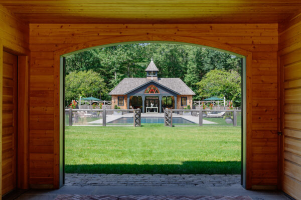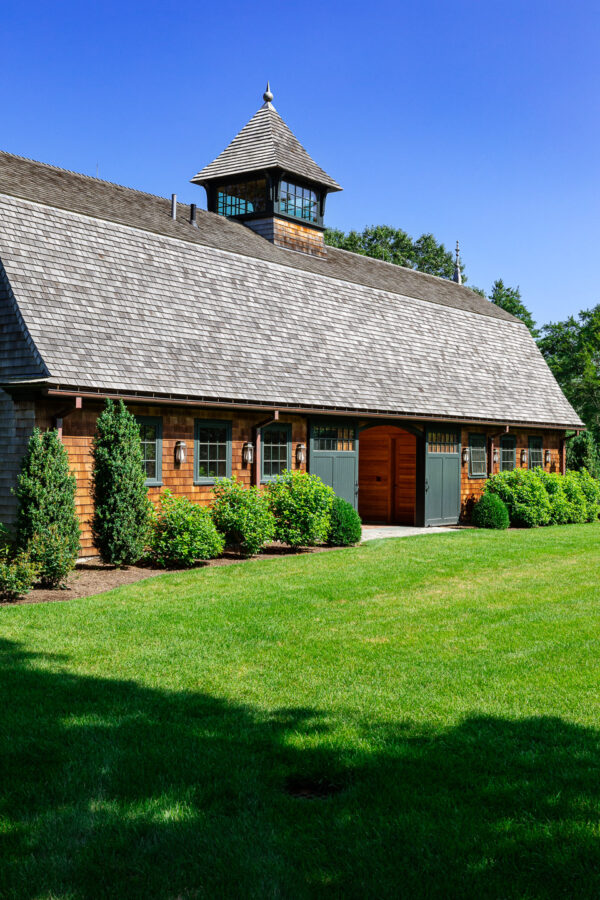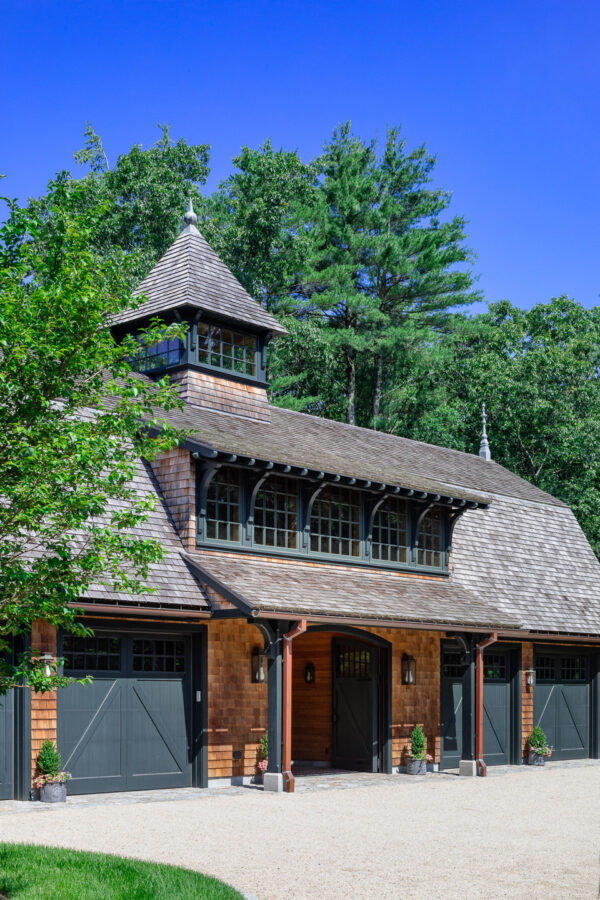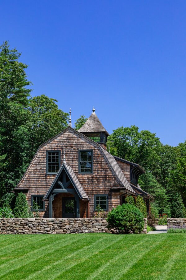 Six Gables our original design, is a distinctive blend of Shingle Style and Gothic architecture located in the Boston countryside. The recent project involved adding a barn for cars and storage, a pool, a pool house, and enhancing the landscaping and driveway approach.