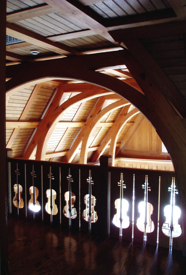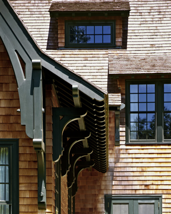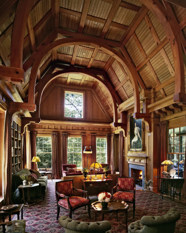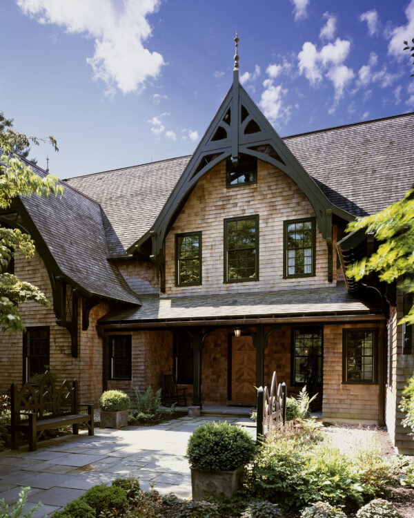 With Medieval overtones, this shingled house centers on a great hall with trusses of reclaimed timbers, and a musicians’ gallery at one end.